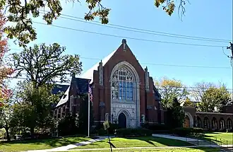 Plymouth Church is an historic congregation located in Des Moines, Iowa and is a member of the United Church of Christ. Plymouth is known for its long history of social justice work including anti-racism and suffrage advocacy, ClimateCare, and aid to unhoused and refugee populations. Plymouth Church is an Open and Affirming church, a Stephen Ministries church, and a Just Peace Church.[2] The church building, located at 42nd and Ingersoll Avenue, is included as a contributing property in the Greenwood Park Plats Historic District and listed on the National Register of Historic Places in 2013.[3] The official name of the church is Plymouth Congregational Church of the United Church of Christ.