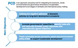 Policy coherence for development (PCD) is the integration of economic, social and environmental dimensions of sustainable development. It aims to improve coherence between domestic policies on the one side, and foreign, international cooperation or development policies on the other side.[5] Related terms which describe similar concepts are policy coordination, environmental policy integration and environmental mainstreaming.[6]