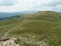 Polonyna (Ukrainian and Rusyn: полонина, romanized: polonyna; Polish: połonina; Slovak: polonina) is a specific, regionally-focused geographic term, that is used as a designation for areas of montane meadows (a landform type) in the upper subalpine or alpine zones of the Carpathian Mountains. The term polonyna was introduced to English from Slavic languages, in order to designate various mountainous regions, mainly in the Eastern Carpathians, and also in the Western Carpathians. The polonyna type areas of montane meadows are very frequent in the Outer Eastern Carpathians, particularly in the Eastern Beskids. Throughout history, they were used for pasture, and in modern times they have become a popular destination for various forms of recreational tourism.[1]