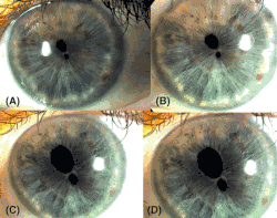 Eye imaging showing polycoria in four different levels of light.