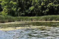 In its upper course the river flows through a morainic region of numerous lakes, in a course characterized by meadows and wooded hills, as well as marshy stretches near areas where the river passes through lakes. The largest lakes on the river include Ten Mile Lake in Otter Tail County; Pomme de Terre and Barrett Lakes in Grant County; and Perkins Lake in Stevens County. The water levels of several lakes on the river's course are maintained by small dams. Downstream of Morris, the river flows on till plains between eroding banks and becomes increasingly turbid. According to the Minnesota Pollution Control Agency, approximately 81% of the land in the Pomme de Terre River's watershed is used for agriculture; of this area, half is used for the cultivation of corn and soybeans, and 43% for that of hay and small grains.[8][10][11]
