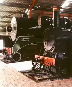 The South Australian Railways owned 129 diminutive Y and Yx class locomotives on its narrow-gauge system from 1885. Beyond Y97 is the broad-gauge 500 ("Mountain") class locomotive number 504, one of 10 introduced in 1926 to haul trains unaided over the Mount Lofty Range. The 500 class was almost 3 times as powerful than the Rx class that it displaced, and 412 times more powerful than its museum neighbour.