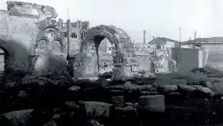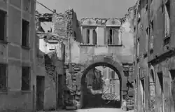 During the Second World War, Porta Montanara survived Rimini's extensive Allied aerial bombardment.[3] On 26 March 1944,[14] bombing hit the Palazzo Turchi and uncovered the walled arch, which had retained its Roman appearance.[3] Following Rimini's liberation, the non-walled arch was destroyed to facilitate the movement of South African tanks through the city.[1][5] The engineers almost destroyed the Arch of Augustus by mistake. The stones of the demolished arch were used to repave destroyed roads.[5]