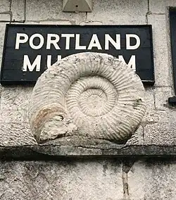 A large ammonite, 0.6 metres (2 feet) across, outside Portland Museum.
