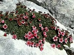 Potentilla nitida, the pink cinquefoil, is a species of cinquefoil in the family Rosaceae that is endemic to the Alps where it grows on elevation of 3,200 metres (10,500 ft). The species is 5 centimetres (2.0 in) tall and 15–30 centimetres (5.9–11.8 in) wide. The flowers grow in pairs and are 2–2.5 centimetres (0.79–0.98 in) long.[1]