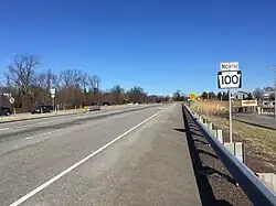 In the 1960s, the Pennsylvania Department of Highways planned for an expressway just east of the PA 100 corridor that would run from the Pennsylvania Turnpike interchange in Uwchlan Township to US 202 near West Chester, though these plans were never fully realized.[28] However, in 1968, a 2-mile (3.2 km) long, four-lane freeway was built connecting PA 100 south of Exton to US 202 north of West Chester. The freeway was officially unsigned, but was colloquially referred to as the "PA 100 Spur" and was designated as State Route 2023 (SR 2023) when the Location Referencing System was established in 1987.[29][30][24][31] In the 1970s, PA 100 was widened into a divided highway between Exton and Lionville.[32]