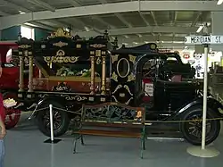 1920s hearse, with open casket and mannequin inside