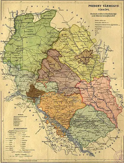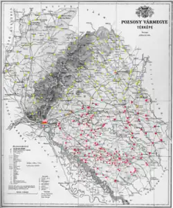 Its name changed along with that of the city of Pressburg (Hungarian: Pozsony, today's Bratislava). Its names around 1900 were Pozsony vármegye in Hungarian, Prešpurská župa in Slovak and Preßburger Gespanschaft in German.