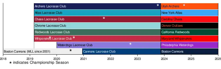 As of the 2024 season, eight clubs with rosters of 25 players each compete in the Premier Lacrosse League, divided equally into two conferences.[27] The Eastern Conference consists of the Boston Cannons, Maryland Whipsnakes, New York Atlas and Philadelphia Waterdogs, while the Western Conference consists of the California Redwoods, Carolina Chaos, Denver Outlaws and Utah Archers.[28] Six of the current teams have competed in the league continuously since the inaugural 2019 season.[29][30] The Waterdogs were admitted as an expansion team in the 2020 season,[31][32][33] while the Cannons moved from Major League Lacrosse (MLL) and began play in the 2021 season.[34][35] The Cannons were the only MLL club to survive the MLL–PLL merger,[35] though the Outlaws, originally founded as the Chrome Lacrosse Club, adopted the identity of the MLL's Denver Outlaws.[36][37][38] The Maryland Whipsnakes are the most successful franchise, having won two championships and finished runners-up twice.[39][40] The Archers have also won two championships, while the Chaos and Waterdogs have each won one championship.[40][41] The Redwoods finished runners-up once, while neither the Atlas, Cannons or Outlaws have yet appeared in a PLL Championship game.