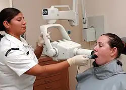 Pregnant women may undergo routine radiographic x-ray images strictly only if necessary during pregnancy. Radiographs should be done with the use of a lead apron and thyroid collar at all times to avoid potential risks to the mother and fetus.[12]