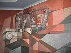 The mural is divided into three parts: a flat, central panel measuring 20 by 6 meters, and two sides panels set off at oblique angles to the central part. Each panel measures 7.6 by 6 meters. The mural as a whole is 211.2 m2.[4] In addition to this, the mural makes use of a staircase with right angles leading up to a second-story art gallery, increasing the total area to 300 m2.