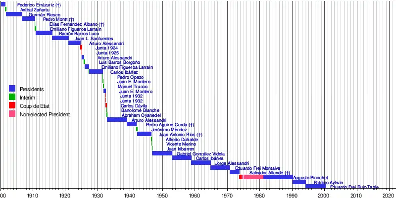 The timeline shows changes, both personal or title, of the head of state and the head of government of the Republic of Chile from 18 September 1810 until today, regardless of whether president, vice-president, supreme director, interim or junta.