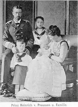 Prince Heinrich was born on 9 January 1900, in Kiel. His father was pleased by the birth of yet another son, especially such a handsome one, as the Prince had blonde hair. The newborn Prince immediately received the title Prince of Prussia with the style Royal Highness, and was baptised Heinrich Viktor Ludwig Friedrich in Kiel Castle on 15 March 1900.[1] His older brothers were Prince Waldemar, a namesake of his uncle, and Prince Sigismund, a namesake of his other deceased uncle. Heinrich was named in honour of his father. The Prince was diagnosed with haemophilia as a young child, but, despite this, was a very cheerful and lively boy who liked to play a lot. As Henry grew older he became more aware of his condition.