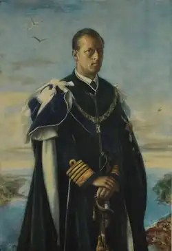 Pietro Annigoni completed a portrait of Prince Philip, Duke of Edinburgh by 1957. He had previously completed portraits of other members of the British royal family, including Queen Elizabeth II and Princess Margaret.[1][2] His portrait of Philip depicts him wearing the robes of the Order of the Thistle.[3] Annigoni painted the portrait for the Worshipful Company of Fishmongers.[4] It was exhibited at the Royal Academy Summer Exhibition of 1957 and subsequently hung opposite Annigoni's 1955 portrait of Elizabeth II at the Fishmongers' Hall but then moved to the landing as Philip reportedly did not like it.[5][4][6] After the portrait went on display at the exhibition, Time wrote that the public was "stewing and snarling" about it, with critics commenting that the portrait makes him look "cold, aloof, almost arrogant."[7][8] Annigoni responded by stating:" I painted him as I saw him. During the sitting he was severe; he showed a strong will, and he was definitely not a man of society."[7]