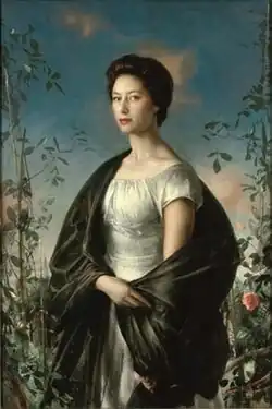 The portrait shows Margaret against the backdrop of an English rose garden, which is a reference to her second name 'Rose'.[1] She reportedly took part in 33 sittings for the portrait, beginning in 1956.[1][2] Annigoni described Margaret as being "enveloped in an aura of sensuality".[2] The painting originally hung in her private apartments at Kensington Palace and had been exhibited at the National Museum of Wales, in Cardiff, in 1977.[3] It was reportedly a favorite of her sister, the Queen.[1]