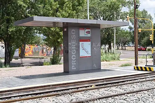 Progreso is a light rail station located at the intersection of Progreso and Valle Grande Streets, in the district of San Francisco del Monte, in Godoy Cruz Department, Mendoza Province, Argentina. It opened on 28 February 2012, as part of the first section of the Metrotranvía Mendoza.