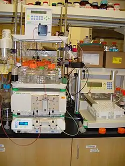 Chromatographic equipment set up for a size exclusion chromatography. The buffer is pumped through the column (right) by a computer controlled device.
