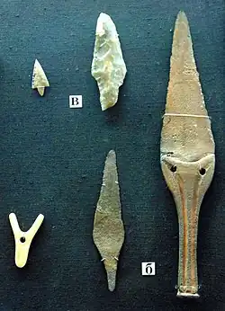 Although Proto-Indo-Europeans have been often cast as warlike conquerors, their reconstructed arsenal is not particularly extensive.[102][103] Several words with the meaning of "spear" (*gʷéru ; *ḱúh₁los), "pointed stick" (*h₂eiḱsmo) or "throwing spear" (*ǵʰai-só-s) are attested.[104] The term *wēben meant a "cutting weapon", probably a knife, and *h₂/₃n̩sis a "large offensive knife", likely similar to bronze daggers found across Eurasia around 3300–3000 BCE. Proto-Indo-Europeans certainly did not know swords, which appeared later around 2000–1500.[105][102][106] The axe was known as *h₄edʰés, while the word *spelo/eh₂ designated a wooden or leather shield.[102] The term *leh₂wós meant "military unit" or "military action",[107][108] while *teutéh₂- might have referred to the "adult male with possession" who would mobilize during warfare, perhaps originally a Proto-Indo-European term meaning "the people under arms".[52][108]