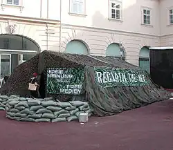 The Free Media Camp aimed at raising public awareness about the extremely precarious situation of independent and participatory media initiatives in Vienna. The camp was established in public space at Vienna Karlsplatz and lasted for almost four months. In sum approximately 100 events (discussions, presentations, music events, screenings...) took place. The camp was organized by Public Netbase in co-operation with local cultural and media initiatives: Malmoe, IG Kultur Wien, Radio Orange 94.0 and Public Voice Lab.[43][44]