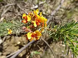 Pultenaea laxiflora, commonly known as loose-flower bush-pea,[2] is a species of flowering plant in the family Fabaceae and is endemic to south-eastern continental Australia. It is a low-lying to prostrate, spreading shrub with linear to narrow egg-shaped leaves with the narrower end towards the base, and yellow and red to brown or purple flowers.