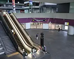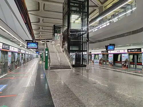 Punggol Coast is an in-house design by the LTA.[20] The station's design features columns inspired by mangroves, with each of the 11 large concourse columns extending into beams that mimic mangrove roots. The station's pendant lights and lofty ceilings contribute to a cathedral-like ambience for commuters.[9] Punggol Coast station has 300 bicycle parking spaces and is air-conditioned by the PDD's cooling system.[9][20] The station also employs a hybrid cooling approach with fans at the platform level, earning it the Green Mark Platinum Certification from the Building and Construction Authority.[20] The multi-purpose public space around the station will be developed as an extension of the SIT campus.[17][21] The station is wheelchair accessible. Wider fare gates allow easier access for wheelchair users into the station.[18] A tactile system, consisting of tiles with rounded or elongated raised studs, guides visually impaired commuters through the station.[18][22]