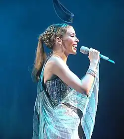 Minogue singing "Put Yourself in My Place" during Showgirl: The Greatest Hits Tour (2005)