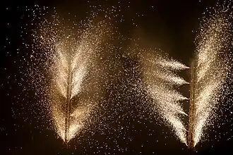 • Gerbs – Pyrotechnic fountains used to produce a controlled plume of sparks, and may be classified as fast gerbs or duration gerbs depending on the burn duration. Special waterfall gerbs are often used to produce an effect similar to a waterfall, using several hung upside down in a line.