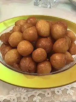 Luqaimat is a dessert made of leavened and deep fried dough balls. The ingredients used to create this sweet pastry are flour, milk, butter, sugar, saffron, and cardamom. After being fried and ready to be served, honey or a sweet syrup is poured on top of it.[4]