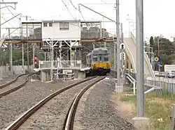 Quakers Hill station opened in 1872 as Douglas Siding. It was renamed Quakers Hill on 30 March 1905 and relocated to its present location on 29 June 1939.[3] Two sets of points at the southern end of the station allow trains to terminate on either platform.