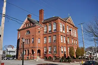 The Quality Hill Historic District is a predominantly residential historic district on the east side of Pawtucket, Rhode Island. This area was developed as an upper-class residential area between the 1850s and the 1940s, and its architecture reflects a cross-section of styles popular in that time. Most of its residential stock is single-family residences, and is generally set on ample lots, although there are areas of more dense construction. The most densely populated area is a section of the neighborhood which was cut off from the rest by the construction of I-95. The most prominent non-residential buildings are the Pawtucket Congregational Church, Saint Raphael Academy,[2] Assumption of the Virgin Mary Greek Orthodox Church,[3] and the complex of the Roman Catholic St. Joseph's Parish.[4]