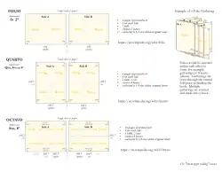 There are variations in how quartos were produced. For example, bibliographers call a book printed as a quarto (four leaves per full sheet) but bound in gatherings of 8 leaves each a "quarto in 8s."[4]