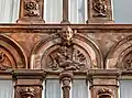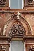The front of the hotel originally included arched windows with eight carved heads, with four heads located over the ground floor windows and four over the first floor. The front also features cherubs, a satyr playing the pan flutes, floral designs, eagles, and keystones carved as human heads.[2] The ground floor carvings have since been removed and the front of the building modernised.
