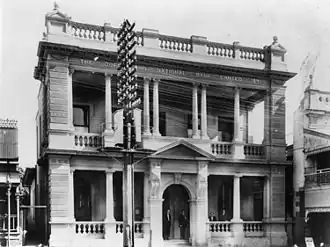 From November 1890, whilst the construction of the building took place, a temporary bank was set up in commercial premises on the corner of Gill and Deane streets. This position was not ideal and it was stated "that any of the junior officers of the Bank will be able to write a brilliant and interesting essay on the odours that arise from the Deane Street open sewer".[25] The QNB's 1880 timber building was sold to the Union Bank of Australia and moved onto the adjacent lot in 1890, then refitted as their bank building.[26][27][1]