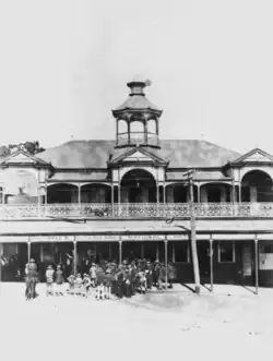 The former Queensland National Hotel is a symmetrically composed two storey timber building with a central and is located on Morgan Street, Mount Morgan.[1]