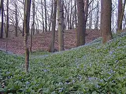 Oaks, pines, and hornbeams comprise the canopy of Räuberberg. Meadow cowslip and wood anemones grow on the ground, while sweet grass family's wood twig forms dense clumps. In springtime, the hollow between the two mounds is covered with two large colorful carpets of sky-blue petals of spring meadow grass. This neophyte, which has been naturalized in Germany, was mainly planted in gardens and landscape parks as ground cover and path edging during the Romantic period. The substantial presence on Talsand Island is most likely the result of plantings by landowner and forester Carl Starnitzky, who passed away in 1814 and had his beloved dogs buried on Räuberberg.[21]