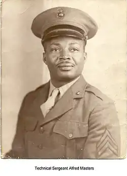 Alfred Masters is the first African-American to enlist in the US Marine Corps since the Revolutionary War and after Executive Order 8802. Masters enlisted June 1, 1942, arrived at Montford Point Nov 17, 1942, and rose to the rank of Technical Sergeant.[11]
