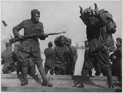 At the start of World War I, there were four regiments composed entirely of black soldiers.[15] Two combat units of African-Americans were established: the 92nd and 93rd Infantry Divisions.[18] The August 1917 Houston Riot of armed African-American soldiers, spurred by racist behavior by Houston police officers, additionally shaped the War Department's decision-making, and the great majority of black soldiers were assigned jobs like the building of roads, unloading of shipping, and other forms of common labor.[19]