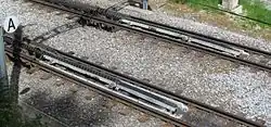 The geometry of the rack system has a large impact on the construction of turnouts. If the rack is elevated above the running rails, there is no need to interrupt the running rails to allow passage of the driving pinions of the engines. Strub explicitly documented this in his U.S. patent.[12] Strub used a complex set of bell-cranks and push-rods linking the throw-rod for the points to the two throw-rods for the moving rack sections. One break in the rack was required to select between the two routes, and a second break was required where the rack rails cross the running rails. Turnouts for the Morgan Rack system were similar, with the rack elevated above the running rails. Most of the Morgan turnout patents included movable rack sections to avoid breaks in the rack,[16][19] but because all Morgan locomotives had two linked drive pinions, there was no need for a continuous rack. So long as the breaks in the rack were shorter than the distance between the drive pinions on the locomotive, the rack rail could be interrupted wherever there was need to cross over a running rail.[14]