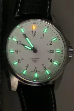 Radium was used in luminous paint until the 1960s, when it was replaced with the other radioisotopes mentioned above due to health concerns.[2] In addition to alpha and beta particles, radium emits penetrating gamma rays, which can pass through the metal and glass of a watch dial, and skin. A typical older radium wristwatch dial has a radioactivity of 3–10 kBq and could expose its wearer to an annual dose of 24 millisieverts if worn continuously.[2] Another health hazard is its decay product, the radioactive gas radon, which constitutes a significant risk even at extremely low concentrations when inhaled. Radium's long half-life of 1600 years means that surfaces coated with radium paint, such as watch faces and hands, remain a health hazard long after their useful life is over. There are still millions of luminous radium clock, watch, and compass faces and aircraft instrument dials owned by the public. The case of the "Radium Girls", workers in watch factories in the early 1920s who painted watch faces with radium paint and later contracted fatal cancer through ingesting radium when they pointed their brushes with their lips, increased public awareness of the hazards of radioluminescent materials, and radioactivity in general.
