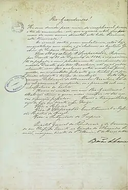 Southern Freemasonry, tending to republican ideals,[19] had an essential role in the directions taken, and many of the Ragamuffin leaders were its adherents, among them, Bento Gonçalves da Silva, with the codename Sucre.[20] Bento organized other Masonic lodges in the territory of Rio Grande do Sul, which he had been allowed to do since 1833.[20]