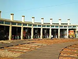 A railway roundhouse is a building with a circular or semicircular shape used by railways for servicing and storing locomotives.[1] Traditionally, though not always the case today, these buildings contained or were adjacent to a turntable.