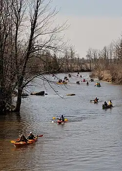 The river's name is an anglicised form of the earlier French settler name "la rivière aux Raisins", which referred to the wild grapes (raisins in French) that can still be found growing along the shores of the river.[1]
