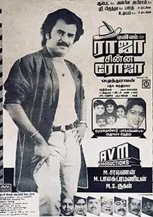 Raja Chinna Roja (transl. King and small rose) is a 1989 Indian Tamil-language children's film, directed by S. P. Muthuraman, and produced by AVM Productions. The plot revolves around Raja (Rajinikanth), who arrives in the city to become an actor. In the process he meets his childhood friend (Raghuvaran) and is forced to take care of his nieces and nephews.