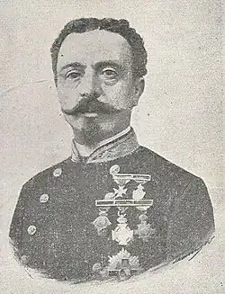 In the early 1890s fellow Traditionalists approached Altarriba cautiously as one of "fractious Carlists".[128] Some sources report him as championing a militant "de armas tomar" group, consisting mostly of the Navarros and the Gipuzkoanos.[129] Other episodes seem to counter this thesis indicating that he worked closely with the non-belligerent de Cerralbo,[130] together travelling across Spain during innovative political tours and delivering harangues,[131] also jointly with Carlist pundits like Vazquez de Mella;[132] residing in Madrid he customarily appeared in events staged in the capital.[133] As the colonial crisis of 1897 unfolded, he initially seemed leaning towards a bold action; he welcomed general Weyler, dismissed from Cuba, amongst the crowd shouting "Viva Cuba Española", but also a somewhat more ambiguous "a caballo mi general".[134] However, during the Spanish–American War Sangarrén was busy denouncing widely circulating rumors about another Carlist insurgency forthcoming as "a fable",[135] though it is not clear whether it was a pre-agreed propaganda smokescreen or a genuine effort. During La Octubrada, the series of minor Carlist revolts of October 1900,[136] he was in Paris,[137] which did not spare him detention by Guardia Civil the following month in Bilbao.[138] Also during persistent rumors of mid-1902[139] Altarriba spoke publicly against a Carlist military action.[140] The press reported him as an agreed Carlist candidate in the 1903 elections,[141] but he was not mentioned as running later on. None of the sources consulted mentions him politically active after that date; obituaries claimed he had been suffering from an unidentified longtime "enfermedad crónica";[142] his funeral was attended by the then Carlist political leader, Matías Barrio y Mier.[143]