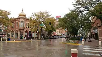 Located at 630 Saint Joseph Street, The Buell Building was finished in 1888 by the Lakota Banking & Investment Co. Its namesake, Charles Buell, purchased it in 1901 to establish his law offices. It was further expanded in 1925 to its present size.[5] The Buell Building is considered one of the best examples of architecture in the district. Much of the original building has been preserved, although renovations on the first floor have replaced much of the original brick and windows. Most notably, the building features an oriel window topped with an onion dome inspired by architecture in Eastern Europe. The rest of its architecture is classed as an eclectic mix of Italianate, Romanesque Revival, and Queen Anne.[2][3]