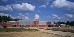 The Ravenna High school building contains 158,000 square feet (14,700 m2) of space and includes the main gym, auxiliary field house gym, auditorium, cafeteria, and around 45 classrooms. The main gym has retractable bleacher seating for 1,125 and the auditorium has seating for 600 with 300 additional retractable seats that can expand into space in the cafeteria. The field house gym includes a rubberized surface which has two full-size basketball courts and an elevated walking track. The building also has two courtyards that separate the three academic sections of the building which are used for natural lighting and can also be used for outdoor teaching space. The building was dedicated August 28, 2010.[9]