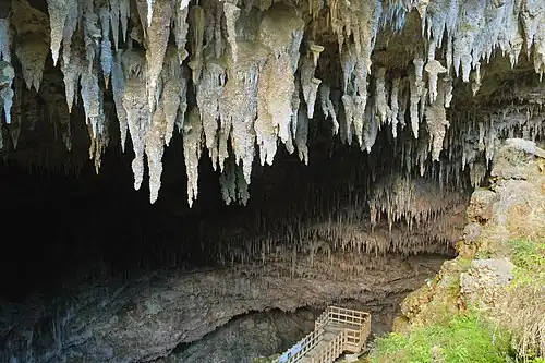 The cave's entrance is one of the largest cave entrances in New Zealand[4] with an opening of about 40 metres (130 ft) wide and up to 20 metres (66 ft) tall.[5] The ceiling is densely covered in stalactites which become increasingly finer deeper down into the cave. A short walking track leads halfway down into the cavernous opening to a viewing platform.