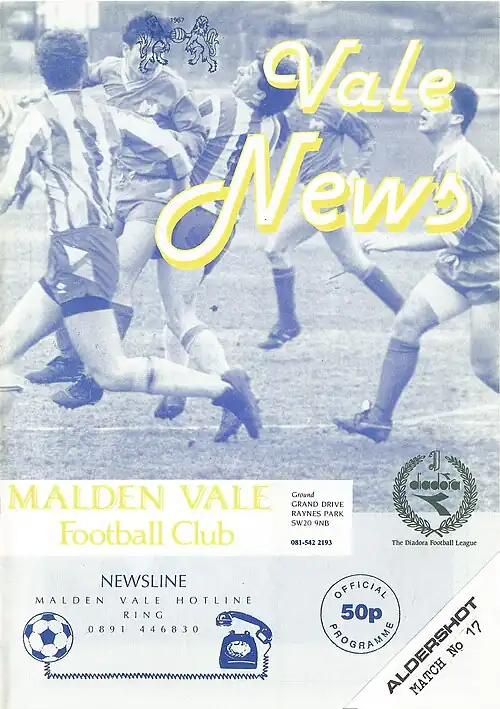 Vale then left for the Combined Counties first incarnation and at the first attempt, won the title. The only league title on either side's resume. Ten seasons later in the 1988–89 season Malden Vale finished runners-up to BAE Weybridge in the Dan Air League and was promoted to the Diadora League Division 2 South. All of the club's members worked extremely hard to gain C Grade status for entry into the league. The club survived for 5 seasons in the Diadora Isthmian League. At the end of the successful 1993–94 season, managers Mick Brown and Ged Murphy left the club to join Hendon. Many of the players followed them and Malden Vale finished bottom of the table the following season.