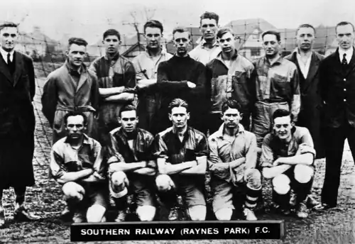 The first notable prominence of the football club in the Raynes Park community was as early as 1925 when Southern Railways Football Section was formed. The club was originally based at Raynes Park Sports Ground, Taunton Avenue, which is less than a mile away from the current club's home. The club played in the Surrey Senior League and were a part of a notable tour to Belgium to play fixtures against Ostend V.G. Club and Bruge FC in 1925. Little is known about these sides other than Railway had success in the 1932–33 Middlesex League and were also double winners in 1936, taking home both the Railway Athletic Association Cup and the Southern Railway Orphanage Cup. The Southern Railway Team fell victim to the notorious 1963 Beeching spending cuts, a national review into modernising the UK's railways. Southern Railways 1950s home kit was gold and green quarters, the company colours.