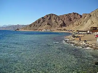 The Red Sea Nubo–Sindian tropical desert and semi-desert ecoregion (WWF ID: PA1325) covers extremely arid land along the northeastern Red Sea, the southern Sinai Peninsula, and on a thin strip along the Israel-Jordan border. Most of the coastal land is flat, but there are high mountains in southern Sinai. Biodiversity is limited by the low moisture levels – some areas go for years without significant rain. Portions of the area support a thin savannah-like cover of widely scattered trees and scrub, surrounded by grasses that briefly flourish after a rainfall. Biodiversity is highest in the mountains of Sinai, and in the wadis and gullies that retain moisture.[1][2][3][4]